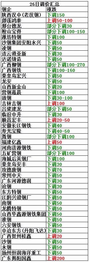 5月26日東方特鋼廢鋼下調50:爐料一3630,爐料二3597,爐料三3564,重廢一3531,重廢二3483,重廢三3418,剪廢一2718,破碎料一3510,破碎料二3224,含稅,結算稅點9.2%。