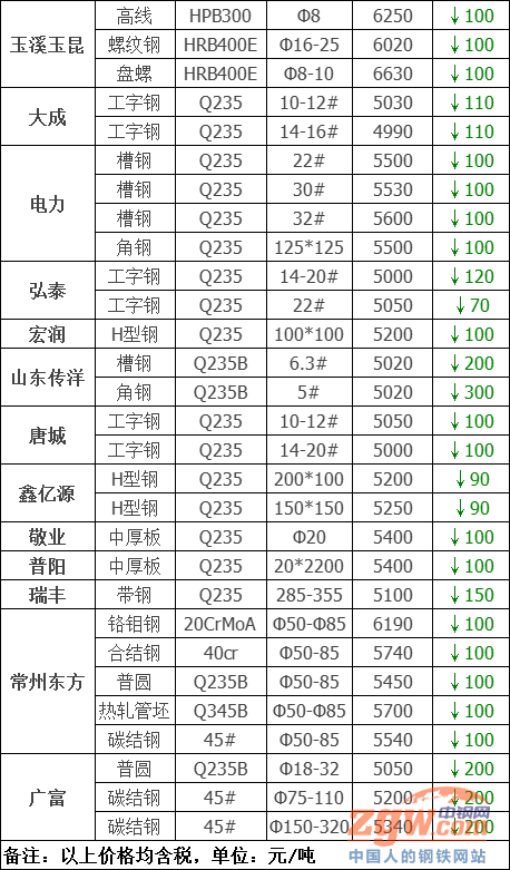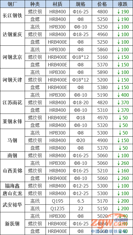 據數據監測,今日共28家鋼廠調價,其中跌幅最大為江蘇雨花高線,調價幅度400元/噸,具體調價明細如下: 鋼廠調價 山西高義建材價格平穩 山西建邦建材價格平穩 新撫鋼建材下調40元/噸 南鋼螺紋鋼下調100元/噸 萊鋼永鋒建材下調50元/噸 馬鋼建材下調50-150元/噸 玉溪玉昆建材下調100元/噸 達鋼重慶建材下調100元/噸 武安裕華高線下調200元/噸 長江鋼鐵建材下調190元/噸 唐山玄龍螺紋鋼下調100元/噸 福海鑫建材價格下調100元/噸 山西美錦建材下調160-260元/噸 河鋼天津建材下調100-150元/噸 河鋼北京建材下調100-150元/噸 江蘇雨花建材下調370-400元/噸 電力型材下調100元/噸 唐城工字鋼下調100元/噸 大成工字鋼下調110元/噸 宏潤H型鋼下調100元/噸 鑫億源H型鋼下調90元/噸 弘泰工字鋼下調70-120元/噸 山東傳洋型材下調200-300元/噸 瑞豐帶鋼下調150元/噸 敬業中厚板下調100元/噸 普陽中厚板下調100元/噸 廣富優鋼價格下調200元/噸 常州東方優鋼下調100元/噸 鋼廠調價占比 下調26家,占比92.9%,調價幅度40-400元/噸。 平穩2家,占比7.1%。 行情簡評 今日鋼廠價格繼續下跌,鋼坯小幅回漲,市場觀望情緒占據主導,午后隨著期鋼持續走高,市場挺價意愿漸起,主導市場價格有所反彈。短期來看,月末商家回籠資金壓力較大,出貨意愿較明顯,終端積極性略有帶動,整體成交暫無明顯放量。考慮到期螺上漲是大幅減倉造成的,具有不穩定性。預計短期鋼廠價格震蕩調整。