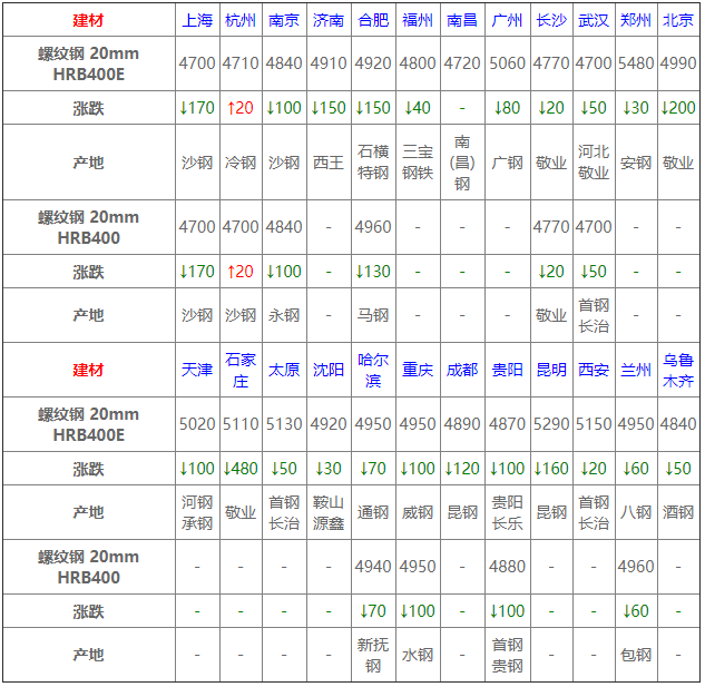 今日建材價格暴跌,部分商家微調部分鋼廠資源價格。政策擾動鋼市,價格非理性上漲后急速調整。南方暴雨北方高溫,供應端持續增加,需求端受傳統淡季影響,疊加月底資金緊張,部分商家急于低價拋貨。預計短期內建材價格寬幅弱勢運行,需警惕政策擾動鋼市。
