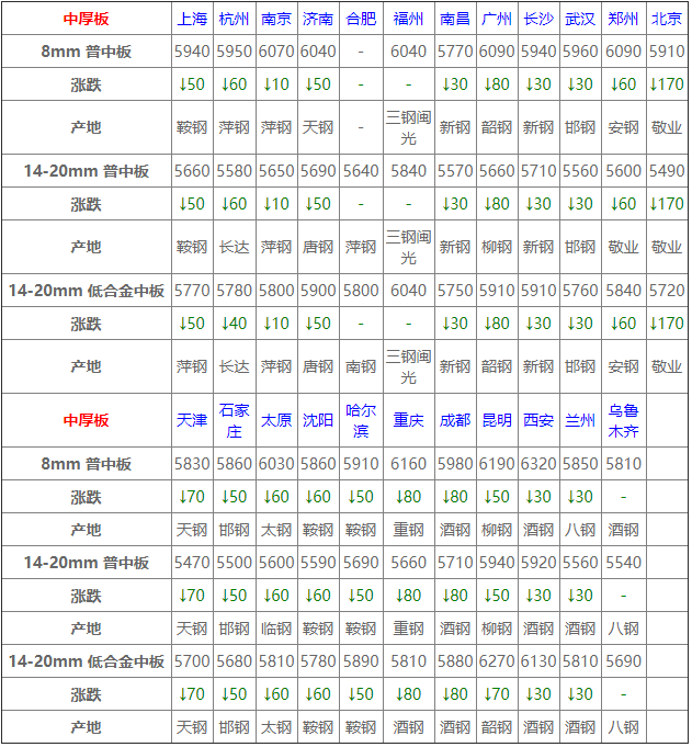 6月1日中厚板價格:主流下調;