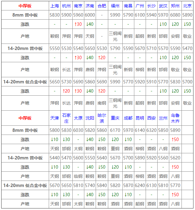 今全國中板漲跌整理,幅度10-100元/噸,期貨大幅拉漲提振市場,上午部分成交有顯好轉,個別資源盤中小幅追高,商家心態多觀望;