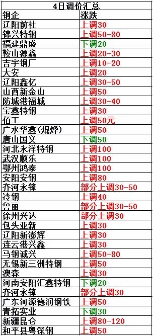 6月4日武漢順樂部分上調100:模具鋼、鋼板料3480,鑄鋼、機生鐵3360,鋼筋頭3430,剪一/中廢3380,剪料3230,重廢一3480,重廢二3430,鋼刨2850,鐵屑碎屑2600,不含稅。