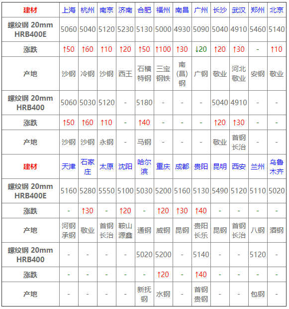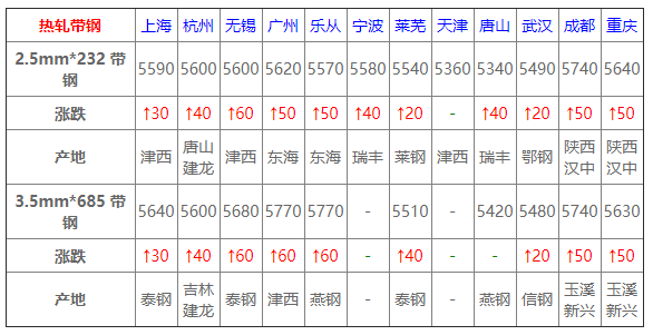 6月10日鋼鐵價格漲跌圖:主流上漲,個別下跌 6月10日建材價格:主流上漲; 今建材整體上漲,市場報價較昨日收盤整體拉漲20-100元/噸,價格上漲,下游整體采購尚可。心態方面,貿易商表示端午節前預計需求將會小幅釋放,因此節前價格趨強運行; 2 6月10日熱軋板卷價格:上行為主; 今全國熱卷穩中偏強運行,幅度20-60,期卷持紅上行,提振現貨市場,商戶挺價意愿趨強,多以出貨為主,然成交跟進不足,市場觀望情緒明顯,預計短期穩中調整;