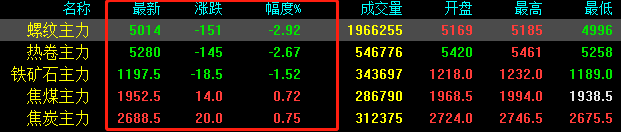 期鋼午后跌幅不斷擴大,期螺下跌151收報50,期卷下跌145收報5280,鐵礦石下跌18.5收報1197.5,焦煤上漲14收報1952.5,焦炭上漲20收報2688.5。