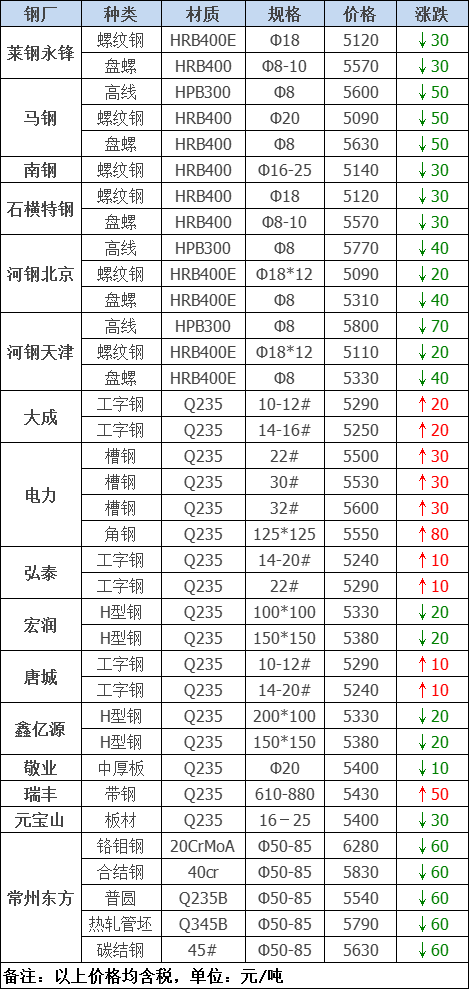 據數據監測,今日共21家鋼廠調價,其中漲幅最高為電力角鋼,調價幅度80元/噸,跌幅最大為河鋼天津高線,調價幅度70元/噸,具體調價明細如下: 鋼廠調價 山西高義建材價格平穩 武安裕華高線價格平穩 福海鑫螺紋鋼價格平穩 馬鋼建材下調50元/噸 南鋼螺紋鋼下調30元/噸 石橫特鋼建材下調30元/噸 萊鋼永鋒建材下調30元/噸 河鋼天津建材下調20-70元/噸 河鋼北京建材下調20-40元/噸 山東傳洋型材價格平穩 電力型材上調80元/噸 唐城工字鋼上調10元/噸 弘泰工字鋼上調10元/噸 大成工字鋼上調20元/噸 宏潤H型鋼下調20元/噸 鑫億源H型鋼下調20元/噸 普陽中厚板價格平穩 瑞豐帶鋼上調50元/噸 元寶山板材下調30元/噸 敬業中厚板下調10元/噸 常州東方優鋼下調60元/噸 鋼廠調價占比 上調5家,占比23.7%,調價幅度10-80元/噸。 下調11家,占比52.6%,調價幅度10-70元/噸。 平穩5家,占比23.7%。