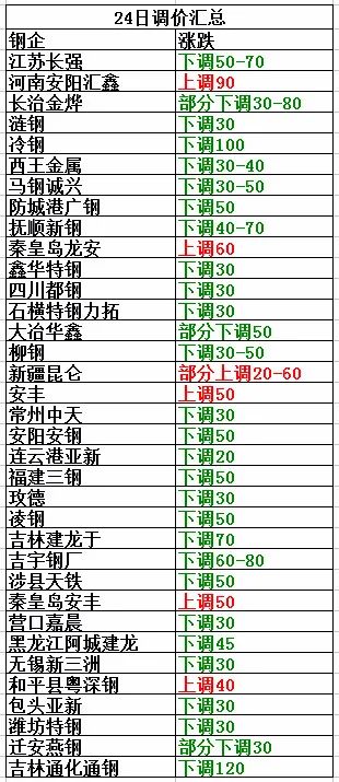 6月24日四川都鋼鋼鐵公司下調30:生鐵3110元;重廢8厘3360、6厘3330、中廢5厘3290、4厘3260、3厘3180、2厘3060-3110,不含稅。
