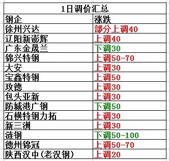 7月1日防城港廣鋼下調50:配重一類3840,配重2類3740,沖片一類3840,沖片二類3900,沖片三類3880,沖片四類3880,壓塊一類3840,壓塊二類3550,剪切一類3680,剪切二類3660,剪切三類3640,剪切四類3470,加工大料1類3150,加工大料2類3050,特優精料2130,特級1260,含稅。