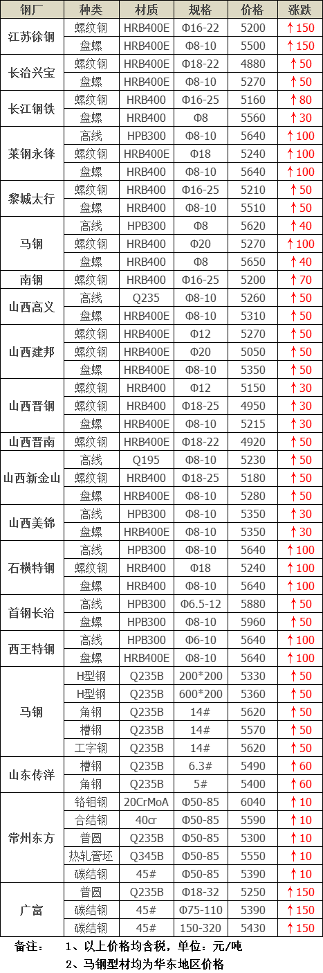 2021年7月10日鋼廠調價通知::調價:大漲150!20家鋼廠最新價格變動!