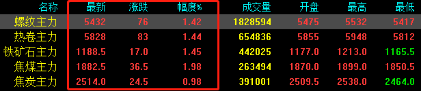 期鋼今日漲幅收窄,期螺上漲76收?qǐng)?bào)5432,期卷上漲83收?qǐng)?bào)5828,鐵礦石上漲17收?qǐng)?bào)1188.5,焦煤上漲36.5收?qǐng)?bào)1882.5,焦炭上漲24.5收?qǐng)?bào)2514。