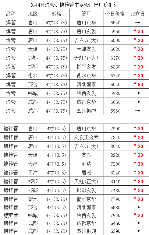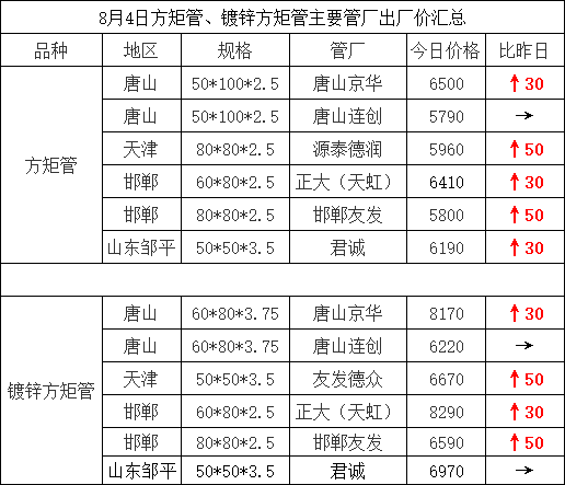 8月4日方矩管/鍍鋅方矩管出廠價格匯總