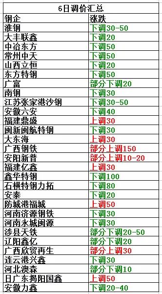 8月6日安徽六安鋼鐵上午9點下調40:鋼筋切粒4080,沖豆4070-4130,冷板壓塊一停收,鋼筋壓塊3970,鋼板料壓塊一4080,鋼板料一4040,鋼板料二3980,鋼板料三3910,優重4010,重廢一3950,重廢二3890,重廢三3820,爐料3920,特級破碎料停收,破碎料一級停收,齒輪軸承鋼4040,含稅。