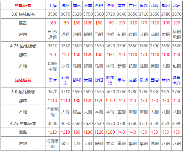 全國熱卷市場高靠為主,上海、南京、安陽、樂從、唐山、天津等地寬幅拉漲,期卷高開提振,成本高走利好,現(xiàn)貨心態(tài)堅挺,資源上調(diào)為主,終端入市積極,交投氛圍良好,預(yù)計短期偏強運行。