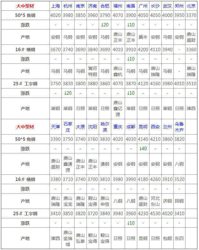 中板24個市場中1個市場下跌10,14-20mm普中板平均價格3865元/噸,較上個交易日價格相同。