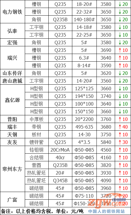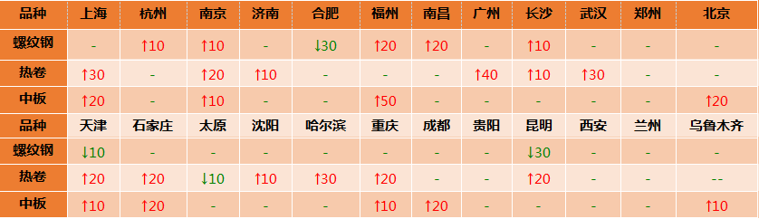 統計的35家鋼廠調價漲幅最高為瑞豐帶鋼,調價幅度40元/噸,跌幅最大為山東傳洋型材,調價幅度20元/噸,具體調價明細如下: