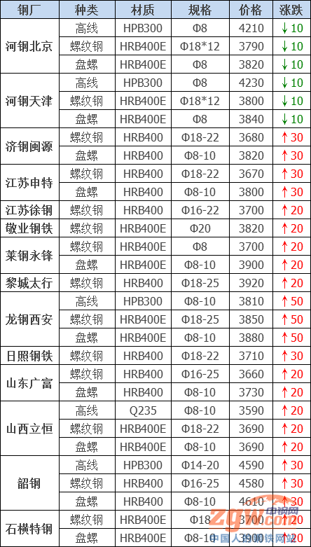 螺紋鋼24個市場中5個市場上漲10-20,2個市場下跌10-30,20mmHRB400E平均價格3805元/噸,較上個交易日價格相同;
