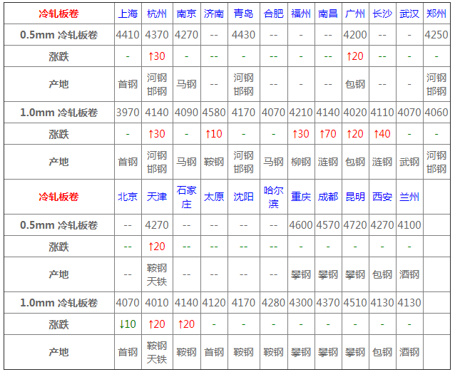今日冷軋市場主穩運行,商家調價謹慎。據了解,今天期貨與鋼坯上行,目前商家心態謹慎樂觀為主。不過高價位同樣導致下游客戶拿貨的積極性有所減退,價格持續上漲市場接受度較低。短期冷軋卷板價格盤整觀望。