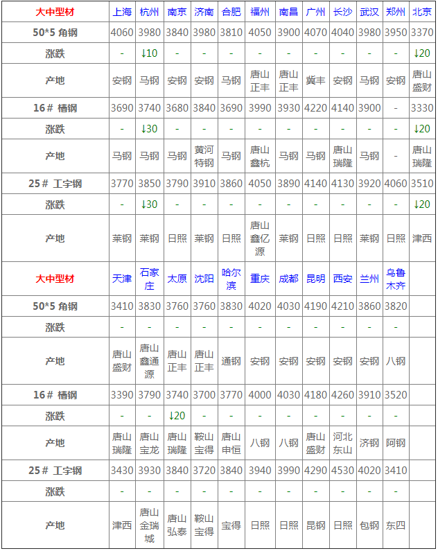 全國各品種鋼材價格一覽表