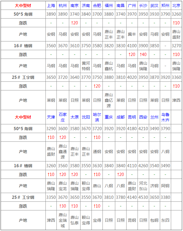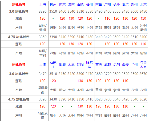 今日華東地區建材成交好于華北地區,商家挺價意愿較強,市場整體成交良好,各地報價普遍上調: