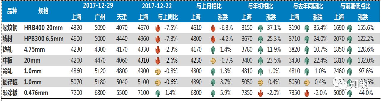 2017年12月份,國內(nèi)鋼材市場總體表現(xiàn)為弱勢運(yùn)行,給大家的感覺似乎是市場下跌得很多,實(shí)際上主要是前期漲幅較大的螺紋、線材出現(xiàn)回調(diào),中板與上月基本持平,熱軋、冷軋、鍍鋅和彩涂板價(jià)格不僅沒有下降,相反卻出現(xiàn)一定幅度的回升。