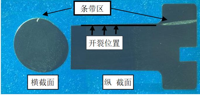 對螺栓橫、縱截面金相檢查表明,開裂位置存在沿軸向分布條帶缺陷。對條帶缺陷及正常位置進行能譜成分分析,結果表明條帶缺陷區域能譜成分明顯區別于基體成分。雖然能譜分析誤差較大,通常適用于定性分析,不適合精確的定量分析,但已能夠說明問題。從顯微硬度結果表明條帶區域硬度明顯低于基體,從而說明兩者存在明顯區別。從金相組織看缺陷部位的組織與基體組織明顯不同,正常基體為回火索氏體組織,而缺陷位置組織為等軸晶,且具有金屬特征。條帶異常區域周圍未見脫碳現象,未見非金屬夾雜聚集現象,故綜合分析認為條帶區域是異金屬夾雜。