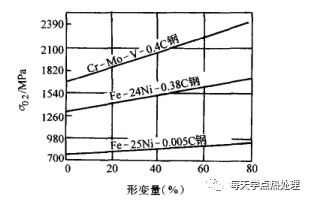 鋼在低溫形變淬火時,亞穩奧氏體強度隨形變量的增加而不斷上升,當形變比例超過40%時,強度上升速度加快,此現象不能單純用位錯密度的增加來解釋,而是由析出的碳化物釘扎位錯引起的,釘扎位錯又引起新位錯大量增加,所以強化作用急劇上升。另外,這樣的強化也有較高的耐回火性。