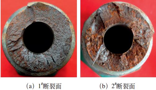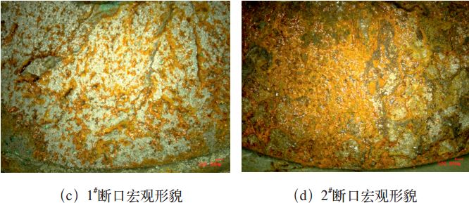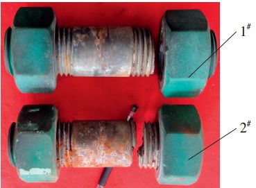 我公司生產的用于回轉部上上框架外側弧形框連接法蘭最外側上部的兩件M56×210螺栓發生斷裂。螺栓規格為M56,所用材料為40Cr,設計要求硬度為28~32HRC,表面鍍鋅,鍍層厚度設計要求為7~12μm。兩件斷裂螺栓宏觀形貌如圖1所示,斷裂位置均位于螺紋段,1#螺栓斷裂位置距端頭約50mm(裝配面附近),2#螺栓斷裂位置距端頭約70mm,斷裂位置未見機械損傷及明顯塑性變形痕跡,斷口及螺栓表面存在明顯的腐蝕痕跡。螺栓緊固件是機械設備上不可缺少的通用零部件,用量大,使用范圍廣,對其斷裂失效原因進行分析是十分必要的。