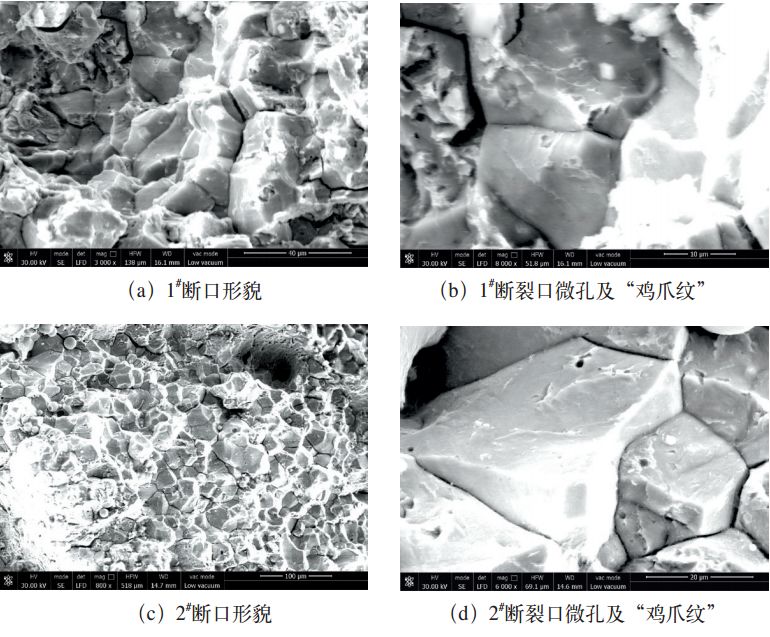 (4)兩件螺栓均斷于螺紋段,斷裂部位未見明顯塑性變形痕跡,斷口表面存在不同程度的腐蝕痕跡。兩斷口宏觀、微觀形貌較為相似,源區位于螺紋根部表面,為線源起裂,源區及擴展區微觀均呈沿晶+腐蝕形貌,可見較多沿晶二次裂紋,晶面可見微孔及“雞爪紋”,部分晶面存在腐蝕痕跡。根據以上形貌特征判斷,兩件螺栓的斷裂模式均為脆性延遲斷裂,機理為氫脆及應力腐蝕。