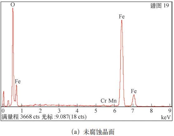 對斷面進行能譜分析,未腐蝕晶面含有Fe、Cr(1.3%)、Mn(0.8%)元素,主合金元素及含量與40Cr牌號相符,腐蝕區域除基體元素外還含有較高的O元素,能譜圖如圖5所示。