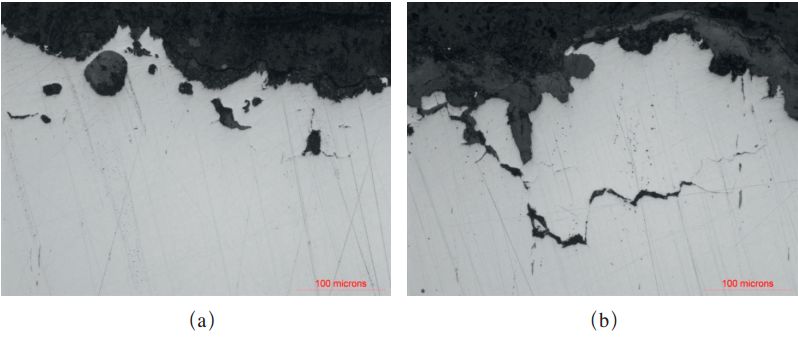 綜合分析認為,兩件螺栓的斷裂模式均為脆性延遲斷裂,機理為氫脆及應力腐蝕。螺栓在使用過程中螺紋根部首先產生氫損傷,后續使用過程中在氫脆及應力腐蝕的共同作用下發生擴展并斷裂。發生斷裂的原因應與熱處理工藝控制不當導致材料硬度過高、具有較高的氫脆敏感性有關。