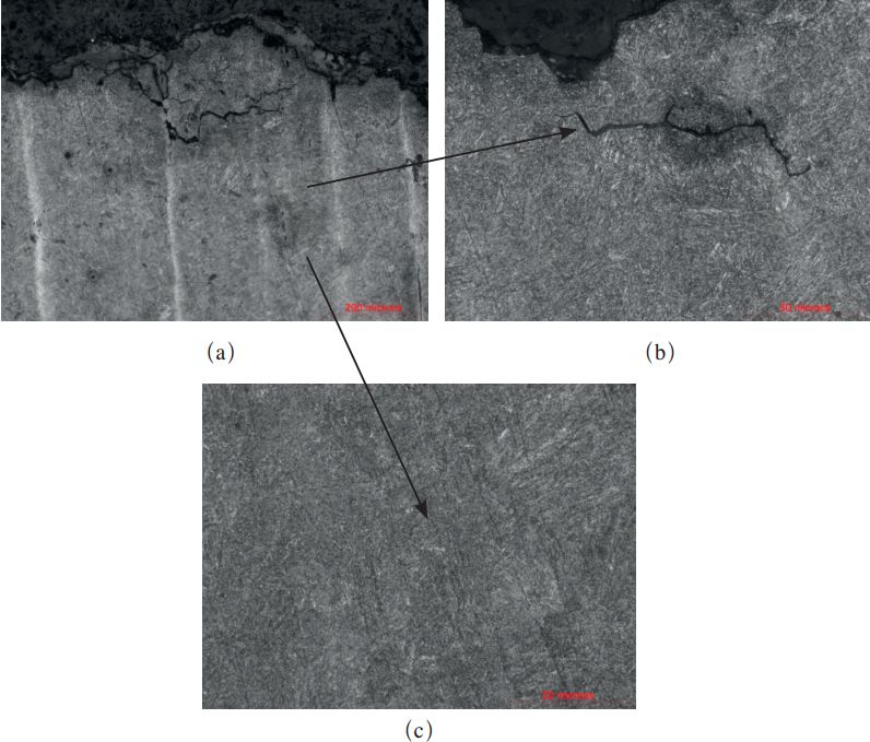 (2)金相分析結果表明螺栓材料組織為馬氏體組織,材料硬度大于46HRC,遠高于設計要求,應是熱處理工藝控制不當所致。