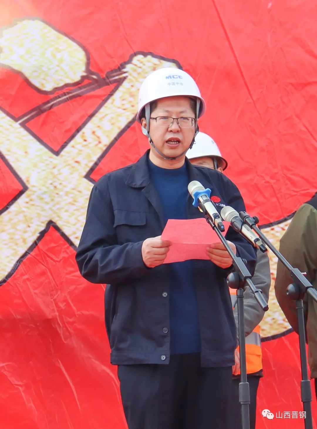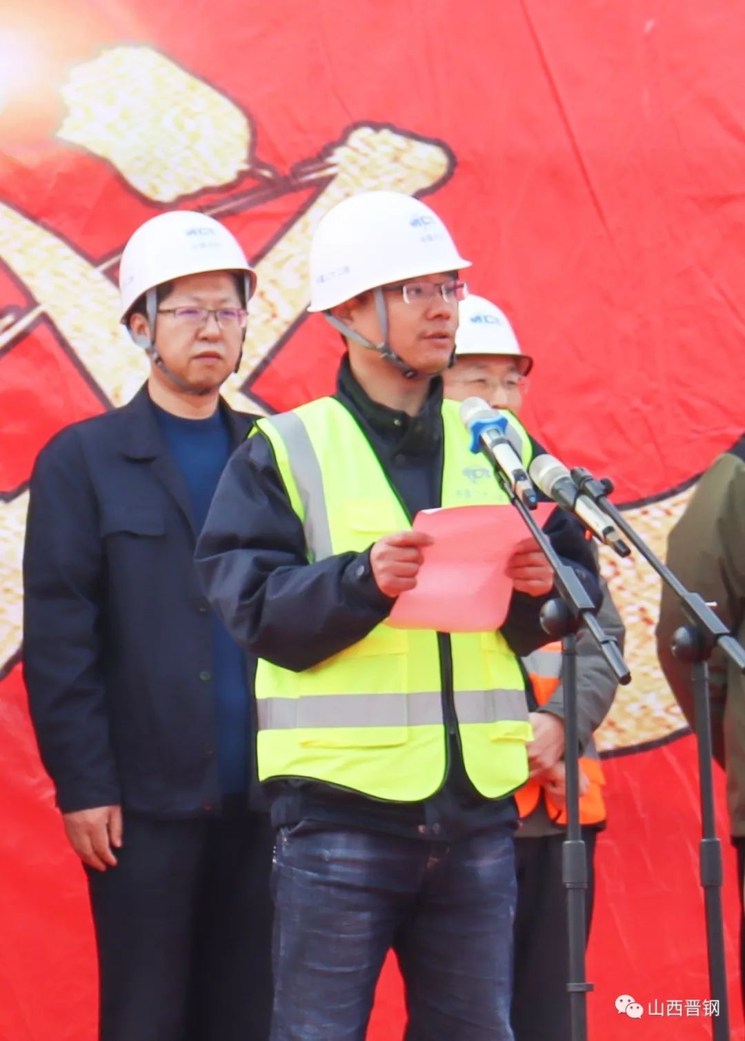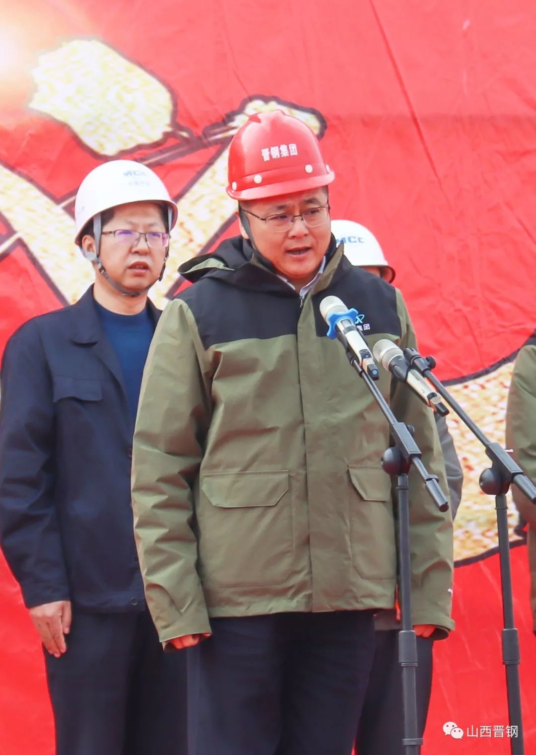 集團副總裁周育輝致詞。冬月的寒冷阻擋不住晉鋼智造園區建設的高漲熱情,今天2×100t轉爐煉鋼項目正式開工,標志著晉鋼智造科技產業園建設進入加緊攻堅階段!目前,園區燒結、球團、高爐等配套項目均已開工,現場一片熱火朝天,轉爐煉鋼項目時間緊、任務重,他希望雙方在施工中加強溝通、通力協作,嚴把工程質量關,共同開啟合作新篇章!