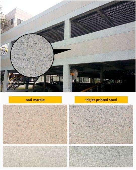 PosART*的涂層粘附力很強,適用于制造高耐腐蝕性和加工性鋼材基板。它不僅可以體現出大理石、木材等各種質感,還可以具備高光澤、高清晰度、高硬度等諸多優點,這是傳統彩涂板產品所不能企及的。由于傳統彩涂產品的涂層易受空氣和濕度影響,易變色,附著力差,易過早剝落,因此,在環保型建筑材料的景觀布置上PosART*可替代大理石和瓷磚。
