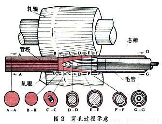 穿孔機(jī) 常用的二輥斜軋穿孔過程見圖2[ 穿孔過程示意]