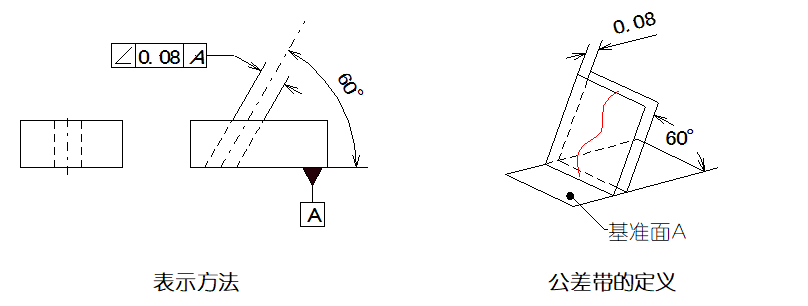 ▲圖例說(shuō)明:在公差值前加注記號(hào)φ,則公差帶必須位于直徑為0.1mm的圓柱面內(nèi)。該公差帶應(yīng)平行于垂直于基準(zhǔn)A的平面B,并與基準(zhǔn)A呈理論正確角度60°。