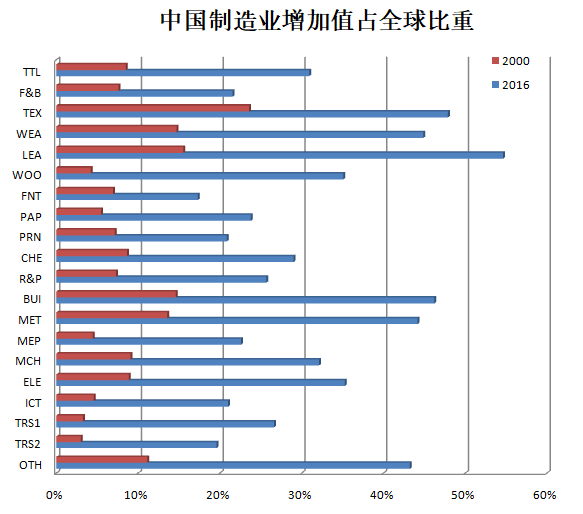 在改革開放的經濟方針指導下,中國在2001年加入世界貿易組織,并不斷努力融入全球產業鏈。經過十多年的積累,中國在全球供應鏈中的參與度不斷加深并逐步成為世界制造業舞臺上的核心成員。根據第一財經研究院全球競爭力項目數據,中國制造業增加值總額占全球比重在2016年超過30%,比2000年增加了3.6倍。其中,紡織品、服裝、皮革制品、非金屬建筑材料和基礎金屬等傳統制造業的比重更是超過了40%。
